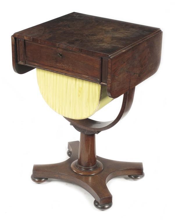 A George IV rosewood work table, the twin drop flap top above a frieze drawer and a pull-out bag, the 'U' shaped support with carved scroll gadrooning, 28.75in (72.6cm) h, 18in (45.7cm) w, 16.75in (42.7cm) d.