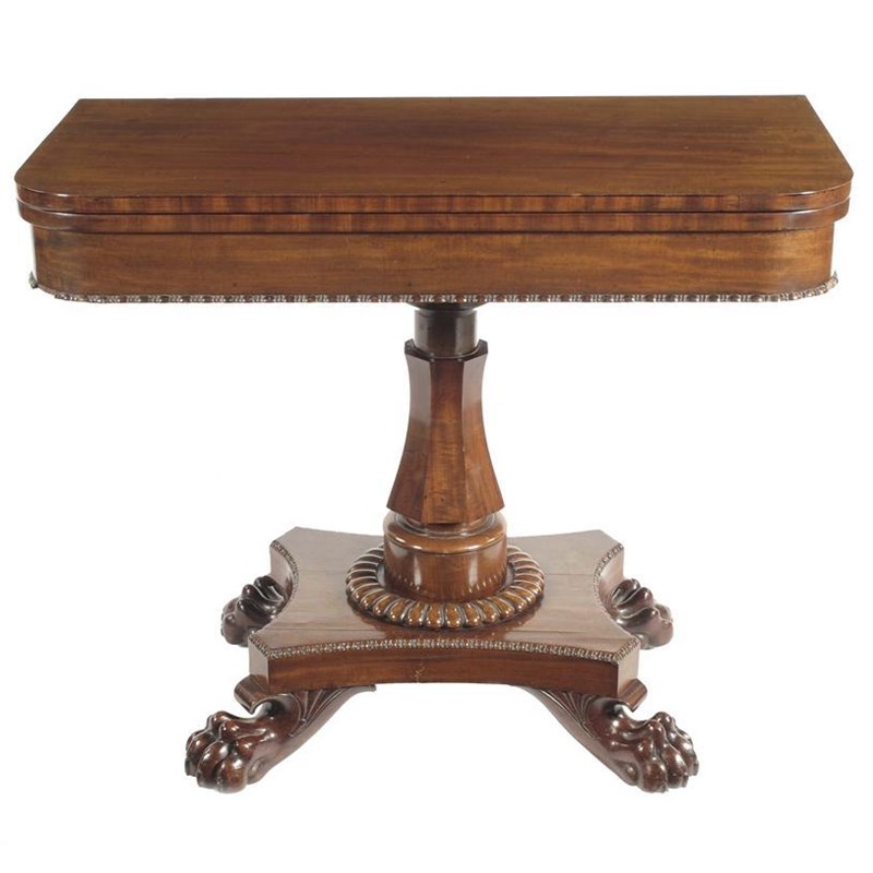 A William IV mahogany card table, the swivel folding baize lined top above a reel moulded edge frieze on a faceted stem to a quatreform base with carved paw feet on brass castors, 29.5in (75cm) h, 36in (91.5cm) w, 18in (46cm) d.