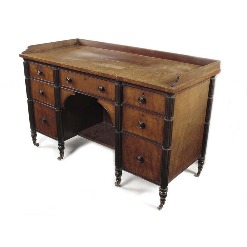 A George IV mahogany kneehole dressing table, the reeded edge 3/4 gallery above an arrangement of five drawers and two cupboard doors, each fitted a turned wood knob handle with turned fluted column supports to brass caps and castors stamped 'CROWNED B S & P PATENT' , 33.5in (85cm) h, 54in (137.2cm) w, 24in (61cm) d. Top faded with water marks and scratches.