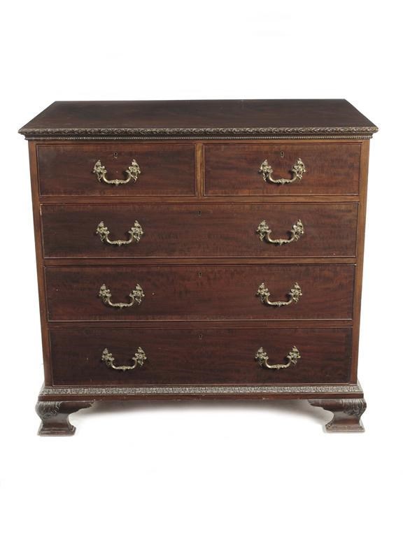 Holland & Sons. A mahogany chest in Chippendale style, the crossbanded top to a flower head carved edge above two short and three long graduated drawers, the top right drawer stamped 'HOLLAND & SONS LTD, MOUNT STREET, LONDON', all fitted cast brass handles each stamped with a shield on leafage carved ogee bracket feet, late 19th/ early 20th century, 36.25in (92cm) h, 38.5in (97.5cm) w, 23in (58.5cm) d.