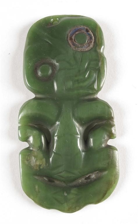 A Maori greenstone pendant, hei tiki, New Zealand, with carved features and haliotis eyes, one missing, pierced for suspension, 4in (9.7cm) l.