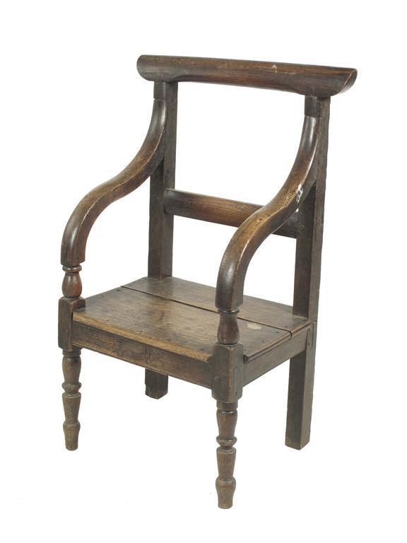 An early 19th century joined oak tavern open armchair, with down curved arms to a solid seat on tapering turned front legs.