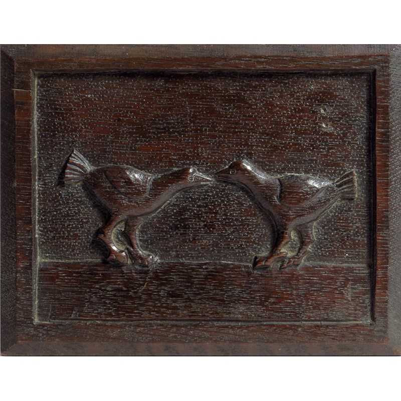A 19th century carved oak panel, depicting a cockfight, 18.3 x 23.5cm.