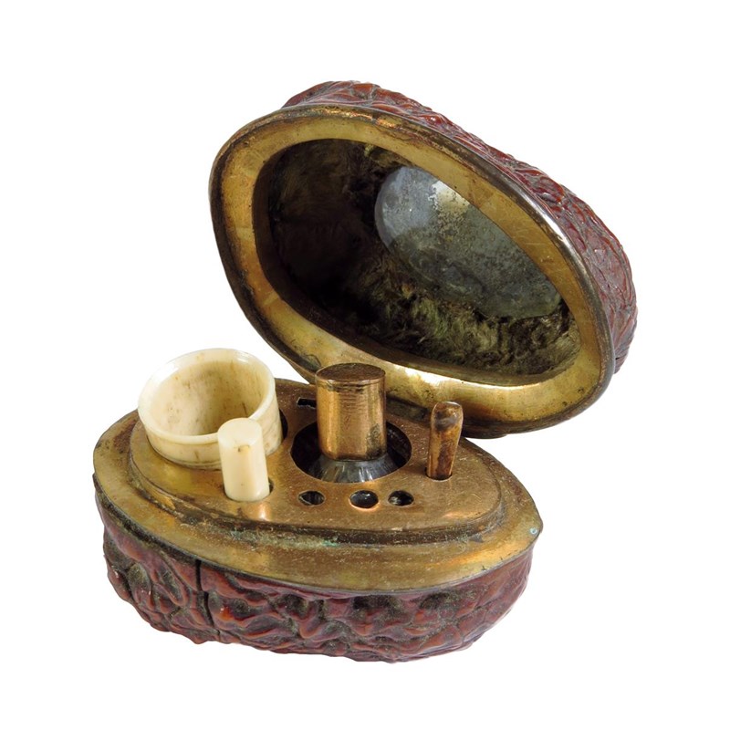 λ A 19th century French walnut and gilt metal mounted étui, the hinged lid revealing a mirror to the underside and fitted with a bone thimble, an ivory case, a cut glass scent bottle and an ear pick, 5cm wide.