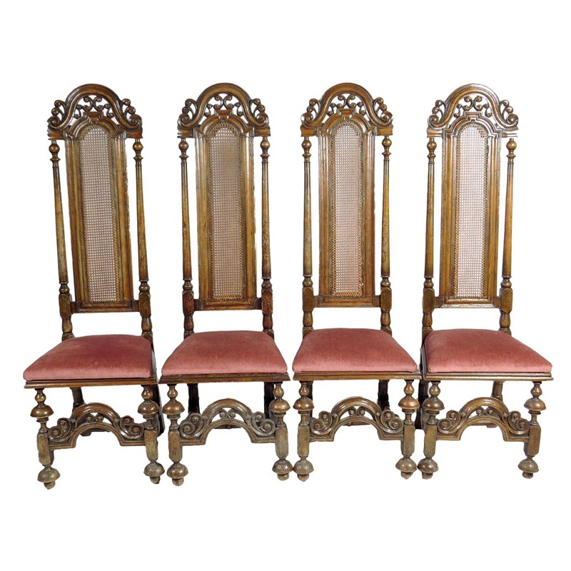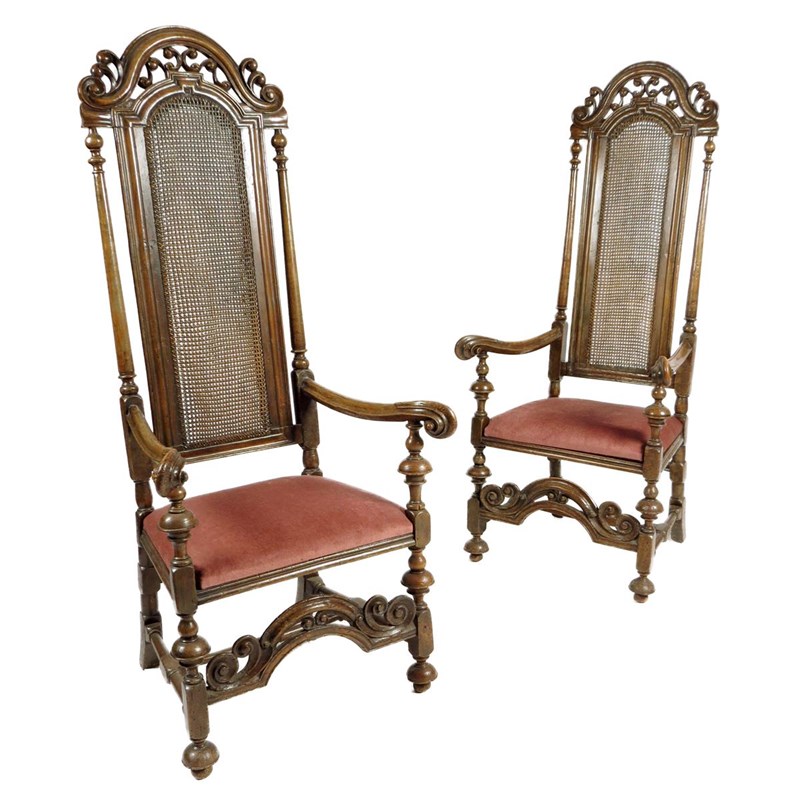 A set of six Queen Anne walnut and beechwood highback chairs, each with a scroll and leaf carved crest above a caned back and seat, with later squab cushions, the mushroom turned and block legs with a conforming arched front stretcher, comprising; a pair of open armchairs and four side chairs. (6)