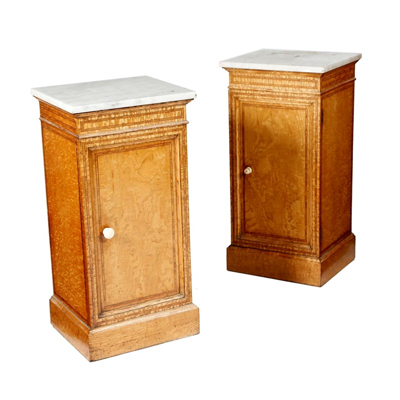 λ A pair of Victorian ash bedside cupboards, with rosewood banding, each with a white marble top above a panelled door with an ivory knob handle enclosing a shelf, 75.7cm high, 38cm wide, 33cm deep. (2)