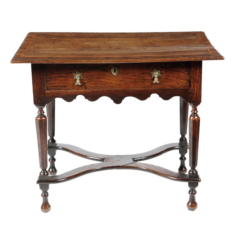 An early 18th century walnut and oak side table, the crossbanded top with a moulded edge and inlaid with holly banding above a frieze drawer on faceted tapering legs united by an 'X' stretcher, 68.5cm high, 83.4cm wide, 52.7cm deep.