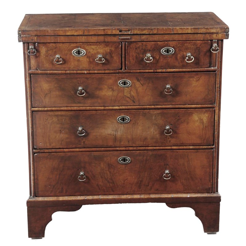 A walnut bachelor's chest, with cross and feather banding, the hinged top above two short and three long graduated drawers on bracket feet, early 18th century elements and later, 79.9cm high, 74.3cm wide, 36.3cm deep.