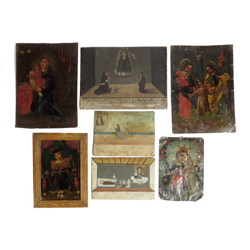 Seven Latin American retablos paintings on tin, depicting religious scenes including: the Madonna and child, a family praying to Maria Santisima de Belen, dated '1892' and Saint Antony of Padua, probably Mexico mid to late 19th century, 35.6 x 26cm (max). (7)