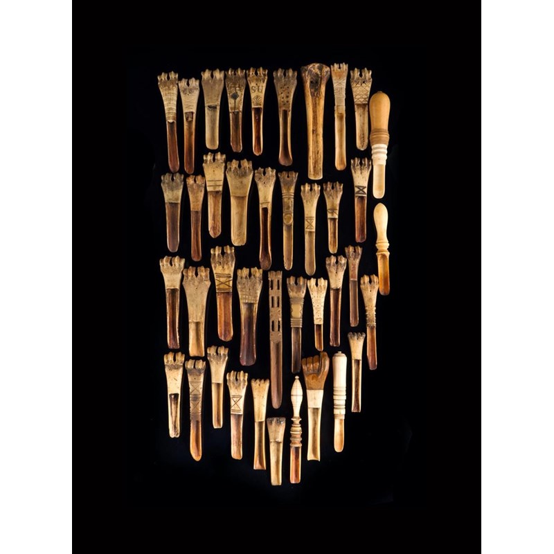 A collection of apple corers, the majority carved from knuckle bones, some with carved decoration and initials, with two ivory apple corers, one in treen, one with a clenched fist handle and a boxwood and bone example, some Napoleonic, 18th century and later, 16.8cm long (max). (40)