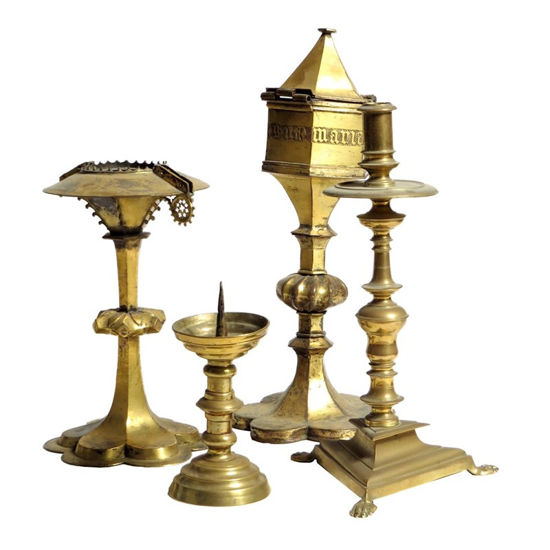 A Gothic gilt copper reliquary, the hexagonal hinged top with a band of script on a lobed stem and petal foot, possibly 15th century German or Italian, together with a similar gilt copper reliquary base and two brass candlesticks, 32.8cm high (max). (4)