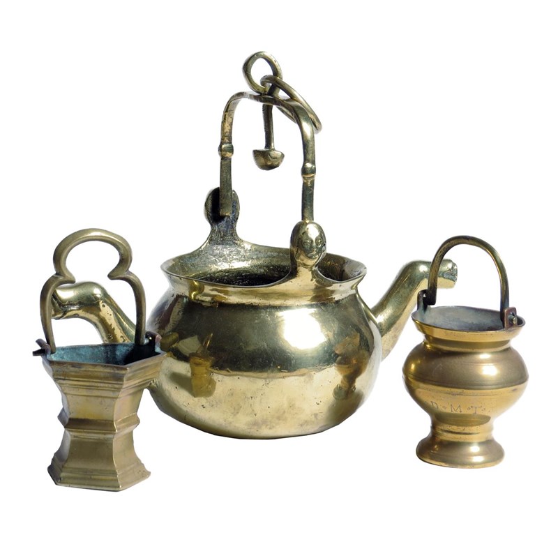 A Dutch polished bronze lavabo, with a swing handle and female mask terminal lugs and with mythical beast spouts, together with two holy water pails, both with a swing handle, one inscribed with initials 'D M T', probably 16th century, 14.9cm high (max). (3)