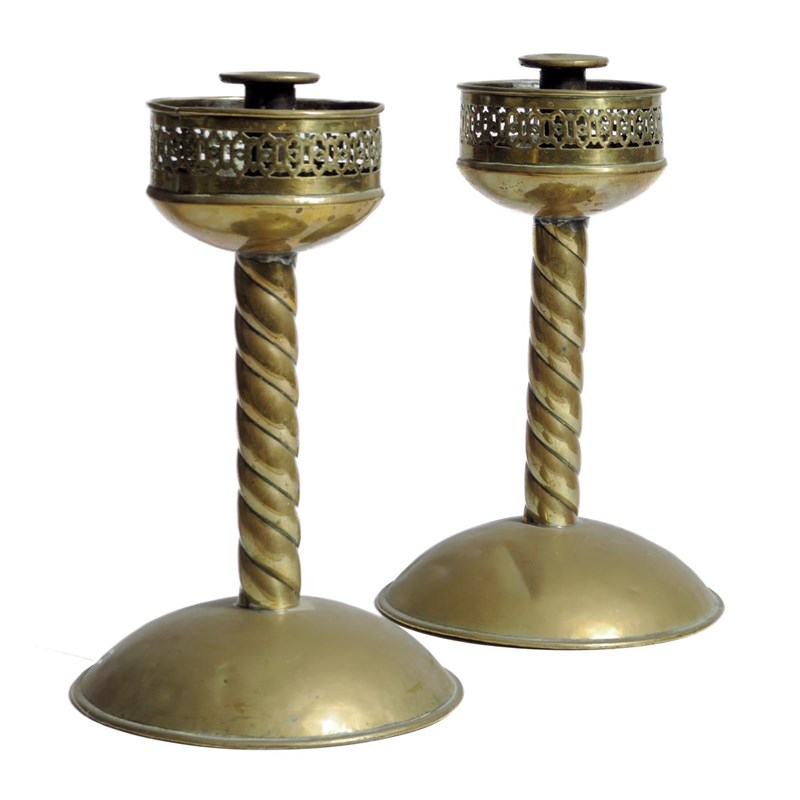 A pair of brass candlesticks, each with a detachable nozzle and a pierced Gothic style galleries, on a spiral twist stem and a domed foot, 30.7cm high. (2)