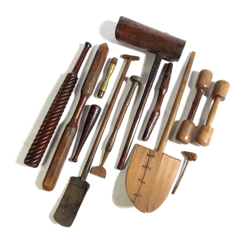 Treen. A collection of carved and turned tools, including: a mallet, dumbbells, a scraper, a spade, a baker's shovel, two clubs, one with a spiral twist stem, the other inscribed 'MACXS, COMET' with an inscribed paper label, in various woods including lignum vitae and hardwoods, 116.3cm long (max). (12)