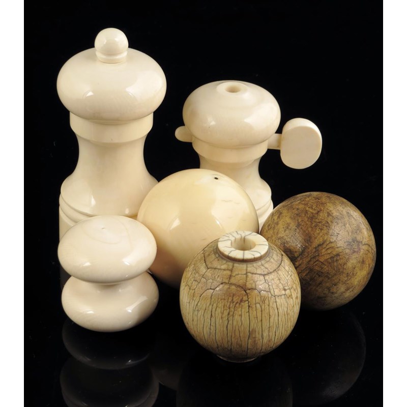 λ A small collection of ivory items, comprising: two billiard balls, a toggle, a winder, a turned grater and a pepper mill, the base stamped 'J. E. PRICKETT & SON, LONDON, N.19', 19th century and later, 10.5cm high (max). (6)