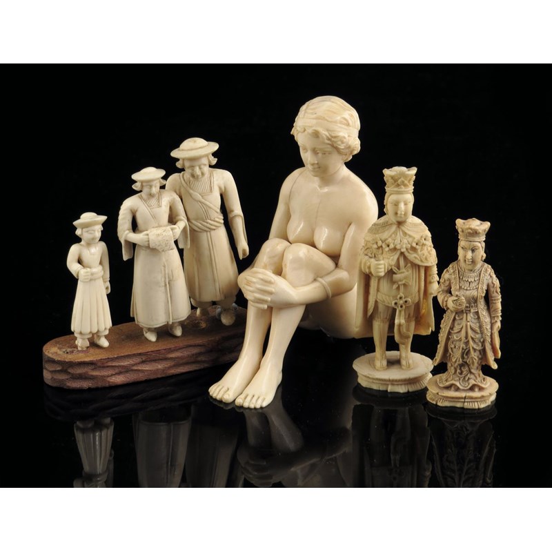 λ An Art Deco carved ivory figure, of a seated naked female, together with two Chinese carved ivory chess pieces and three Indian ivory figures, 8.5cm high (max). (6)