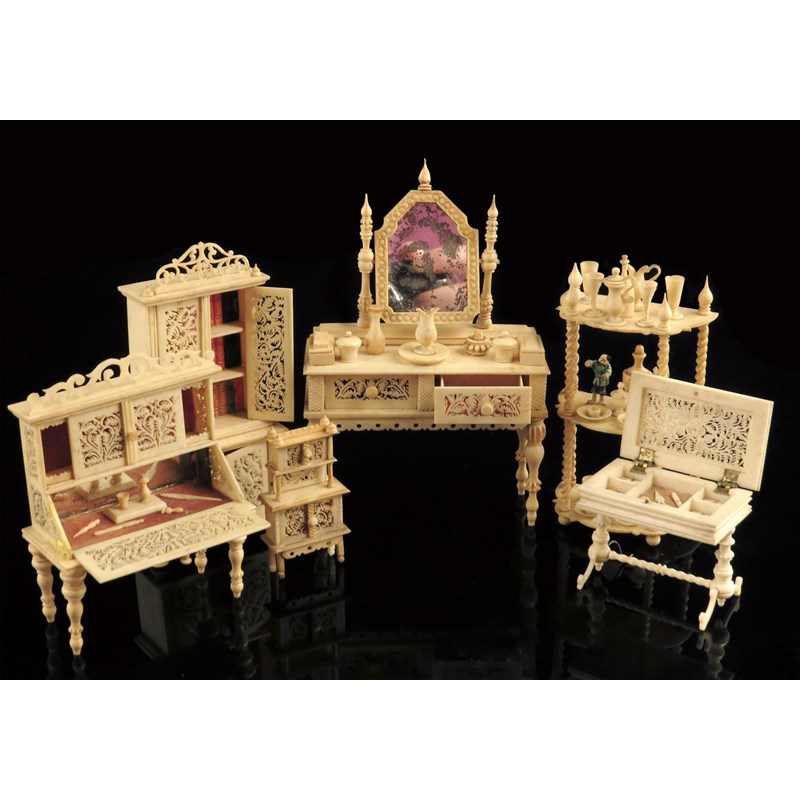 A collection of 19th century bone doll's house furniture, with pierced fret carved and turned decoration, comprising: a dressing table with a swing mirror, the drawers containing a comb and other items, a bureau, the interior with a quill, seal and other items, an etagere with plates, pots, goblets and Chinese style figures, a work table, a bookcase the interior with books and a small cabinet, 12.6cm high (max). (6)