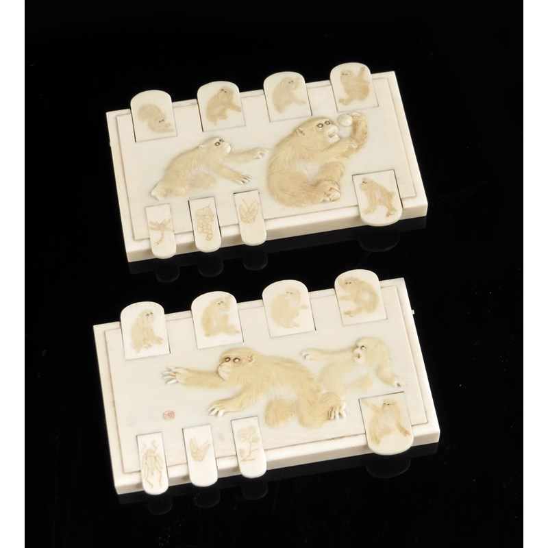 λ A pair of Japanese ivory whist markers, each carved with monkeys, and engraved with insects and flowers, signed, Meiji 1868-1912, 9cm wide. (2)