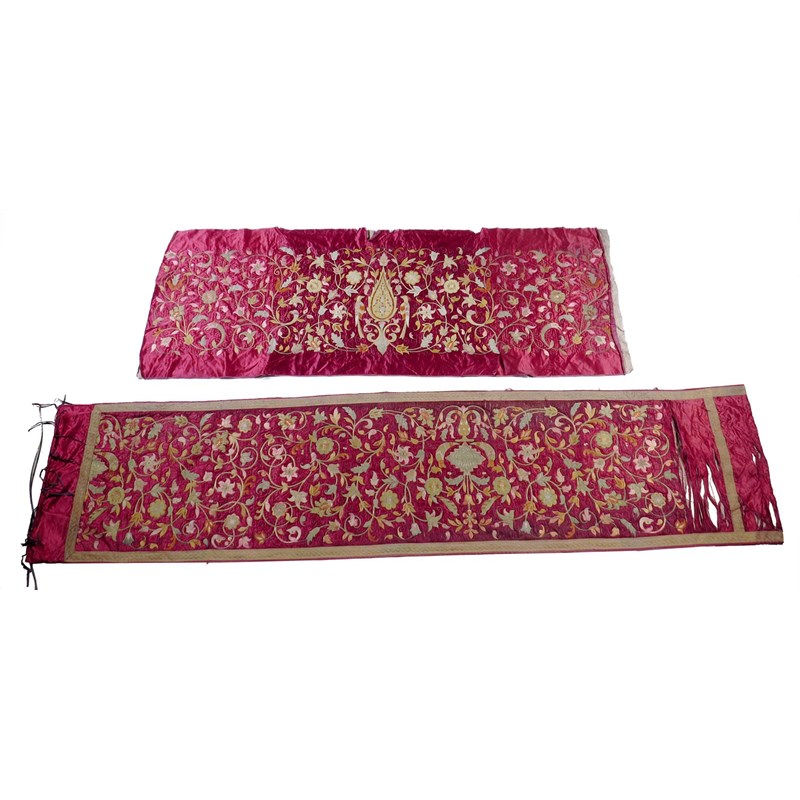 Four Ottoman or Persian silk and metal thread embroidered needlework panels, worked with coloured silks and gilt and silver thread, decorated with scrolling leaves and flowers with birds and urns, on a rich ruby red ground, two with cartouches inscribed with script, possibly table runners, late 18th / early 19th century, 69 x 485cm (max). (4)