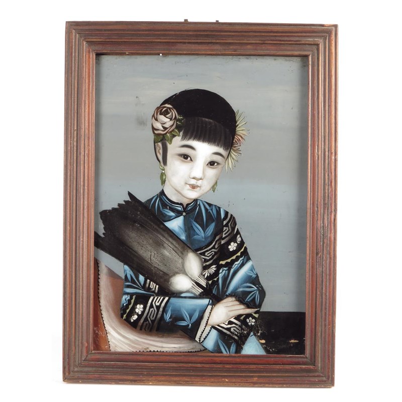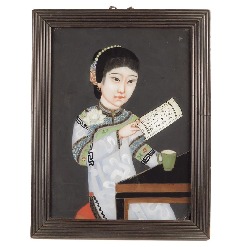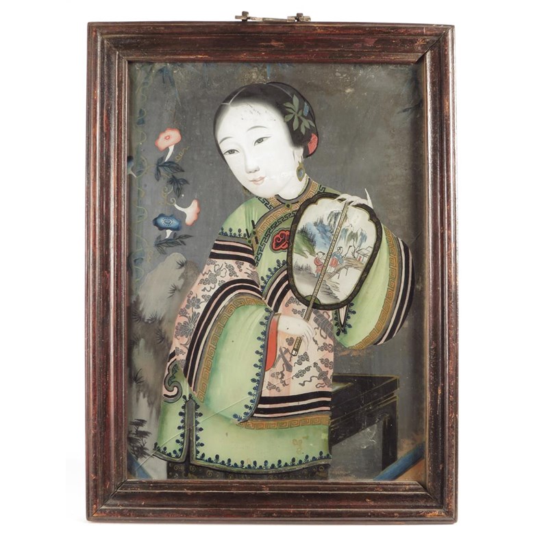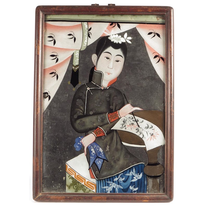 Four Chinese reverse glass portrait paintings of ladies, two behind mirrors, 19th / 20th century, 48.8 x 33.5cm (max), all framed. (4)