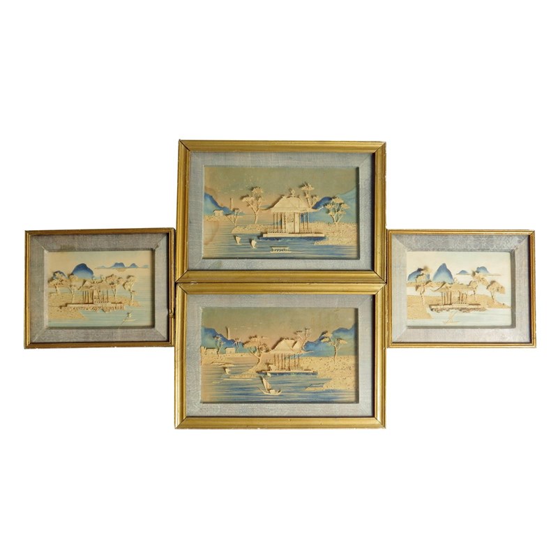Four Chinese cork and watercolour pictures, depicting lake scenes with buildings, boats and figures, each in a glazed, moulded gilt frame, early 20th century, 23 x 33.2cm (max). (4)