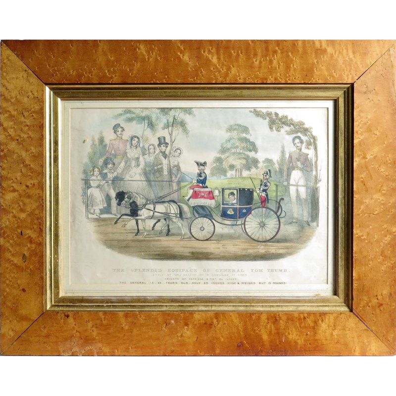 A Victorian coloured lithograph of Tom Thumb, titled 'THE SPLENDID EQUIPAGE OF GENERAL TOM THUMB, BUILT BY MR J BEATON No. 16 DENMARK ST. SOHO, HEIGHTH OF CARRIAGE 3 FEET 6 1/12 INCHES, THE GENERAL IS 13 YEARS OLD, ONLY 25 INCHES HIGH & WEIGHS BUT 15 POUNDS