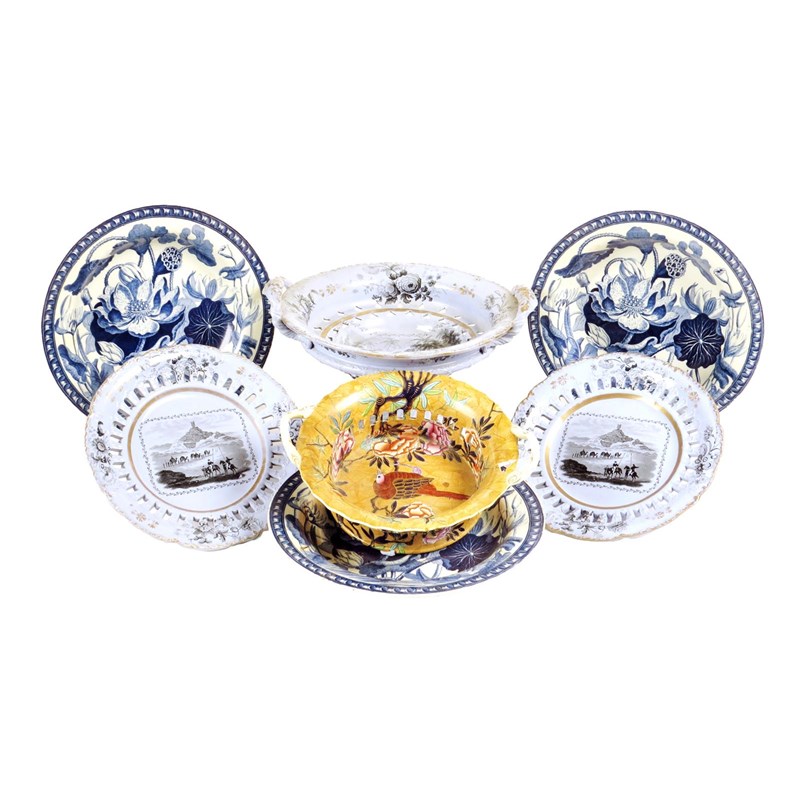 Three 19th century Wedgwood pearlware blue and white botanical bowls, with impressed marks, a pair of pottery plates and a comport with reticulated decoration and printed with 'VIEWS IN MESOPOTAMIA' and a Spode basket, impressed and printed marks, 29.3cm wide (max). (7)