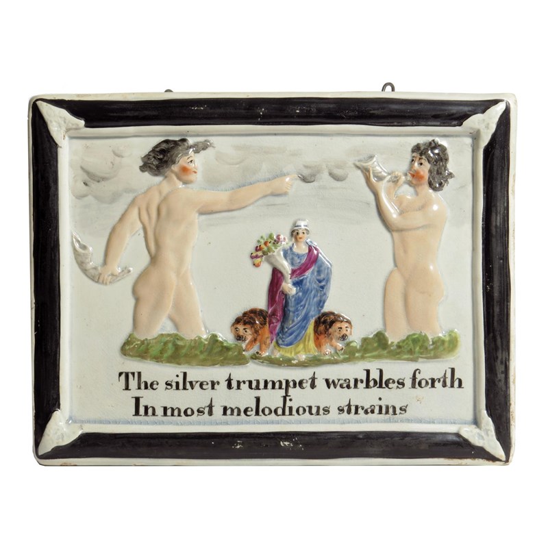 A George III Staffordshire pearlware pottery plaque, moulded with a pair of naked male figures blowing their horns, flanking Plenty holding her cornucopia with two lions inscribed 'The silver trumpet warbles forth In most melodious strains', within an incised inscription to the verso, 18 x 23.1cm.
