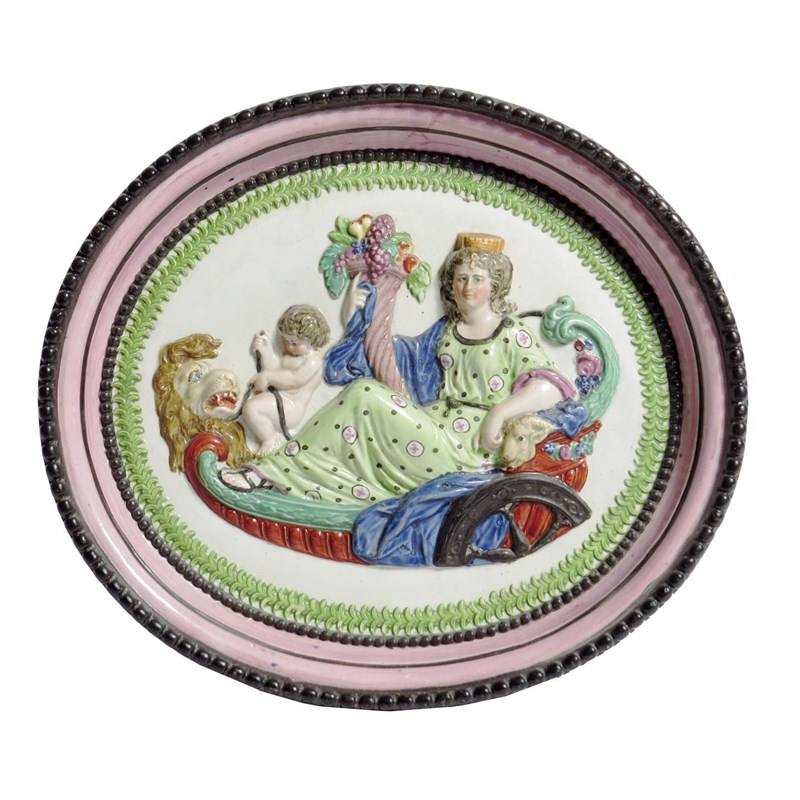 A George III Staffordshire pearlware pottery oval plaque, moulded with Plenty holding a cornucopia of fruit and flowers and seated in a chariot with a cherub drawn by a lion, the verso with a printed paper label for 'JONATHAN HORNE', 20.8 x 23.4cm.