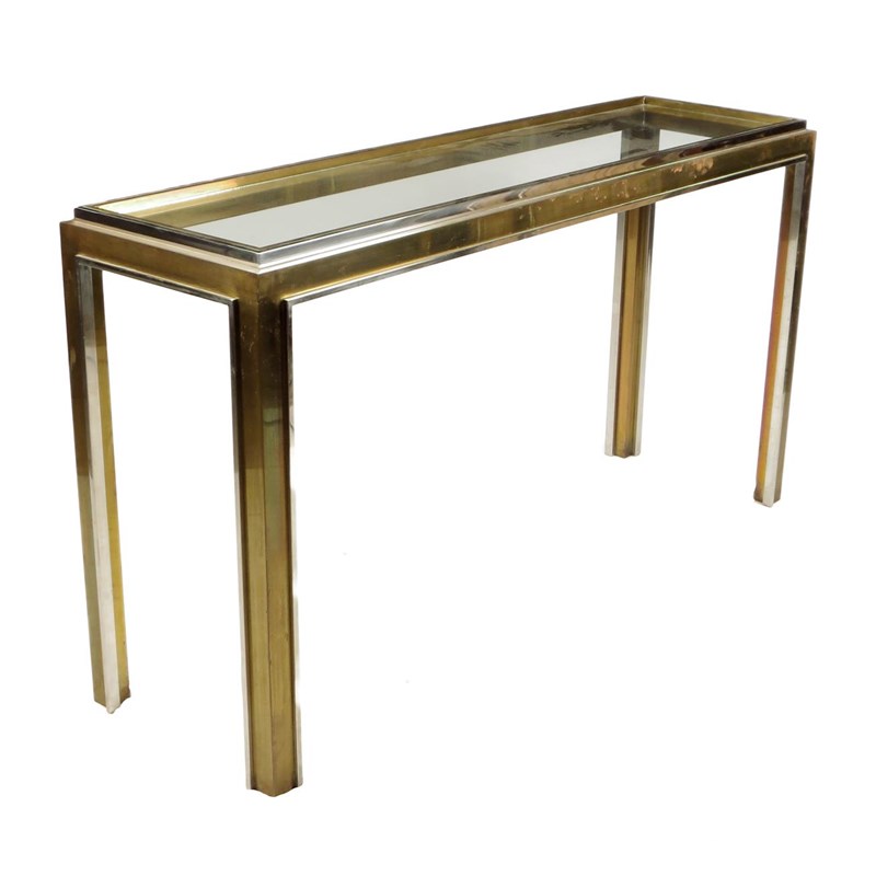 A modern brass and silvered metal console table, with an inset glass top, 77.7cm high, 141.4cm wide, 42.3cm deep.