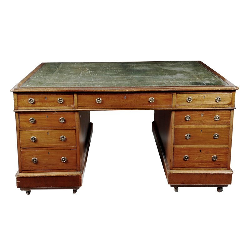 A Victorian and later mahogany partner's pedestal desk, the top inset with gilt tooled green leather and with a moulded edge and with nine drawers to each side raised on wooden castors, 77.7cm high, 151.5cm wide, 128.5cm deep.