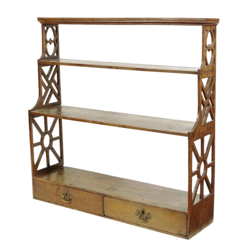 A set of George III oak and pine hanging wall shelves, with three tiers and fret carved ends, the base with a pair of drawers, 95.3cm high, 95.9cm wide, 25cm deep.