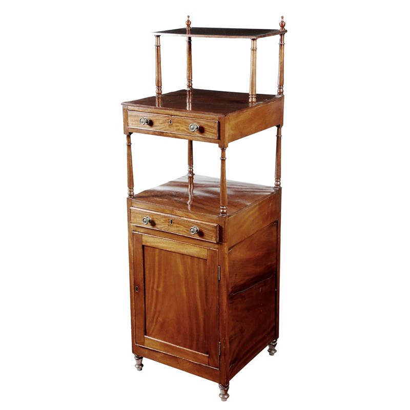 An early 19th century mahogany whatnot, the raised top with urn finials and with a frieze drawer above a further drawer and a panelled cupboard door enclosing a shelf, 141.7cm high, 45.5cm wide, 44.5cm deep.