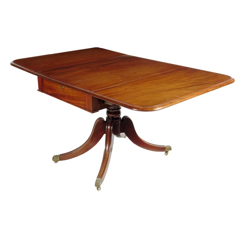 An early Victorian mahogany supper table, with a frieze drawer to either end on moulded legs and foliate cast brass castors, 71cm high, 62.7cm wide (closed), 90.7cm deep.