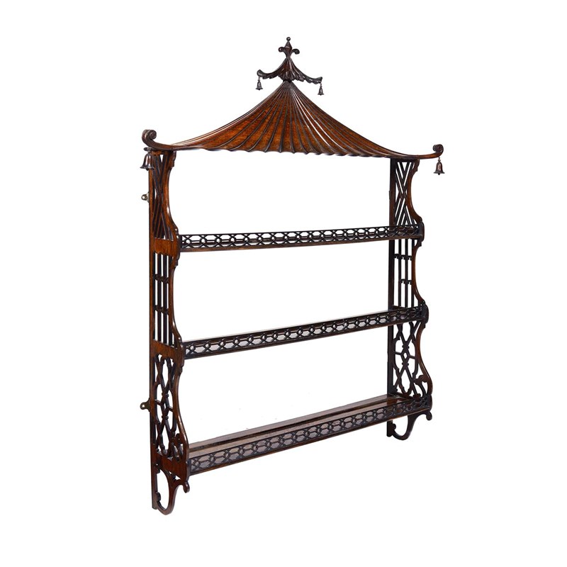 λ A set of George III 'Chinese Chippendale' rosewood hanging wall shelves, with a carved pagoda top hung with bells above three graduated tiers with fretwork galleries and with pierced fretwork ends, 129.8cm high, 109.4cm wide. 19.1cm deep.