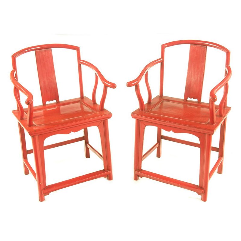 A pair of Chinese red lacquer elbow chairs, with solid splat backs and seats, on stretchered supports. (2)