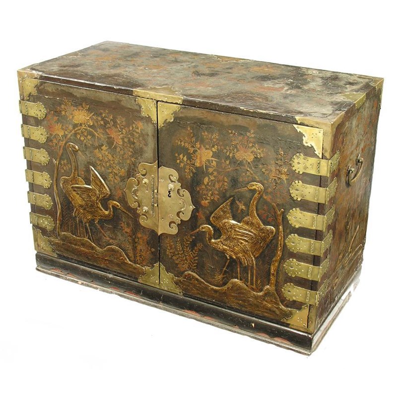 A 19th century Japanese lacquer and brass mounted cabinet, with floral and bird decoration, the pair of panel doors enclosing an arrangement of sixteen drawers, fitted ring handles, two with locks, 31.5in (80cm) h, 44.75in (113.6cm) w, 21.5in (54.5cm) d.