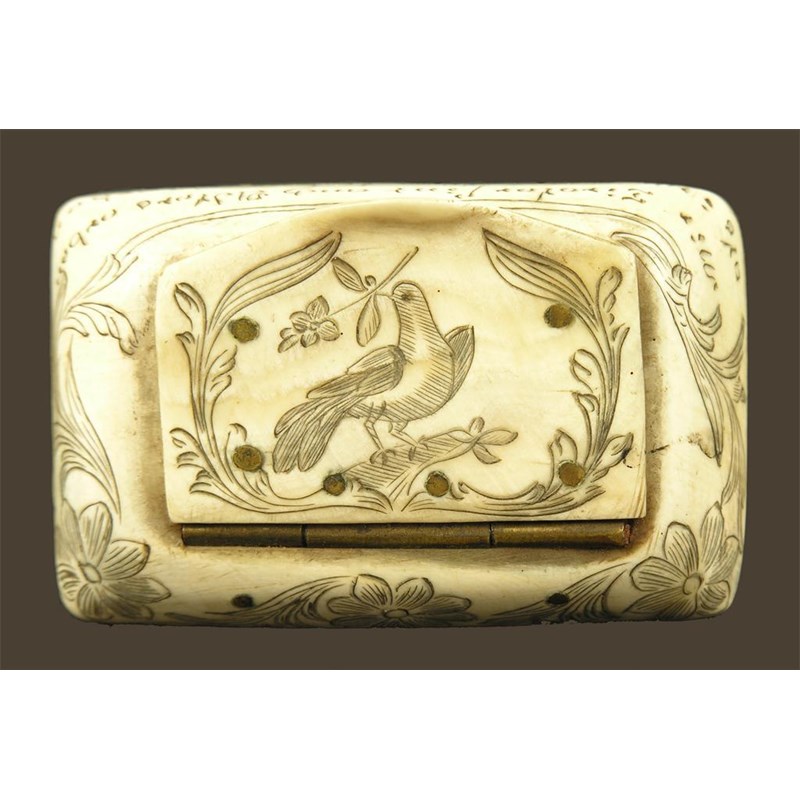 An early 19th century continental horn snuff box, the hinged cover engraved a dove with an inscribed band and foliage, the reverse with a male figure inscribed '1809' and 'Undre Soper,' 2.75in (7cm) w.