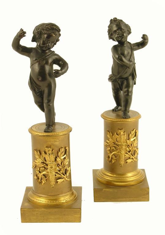 A pair of late 19th century French bronze putto, on gilt columns with applied bow, sheath of arrows and foliage with a square base, 10.75in (27.5cm) h. (2) The figures previously supporting sconces.