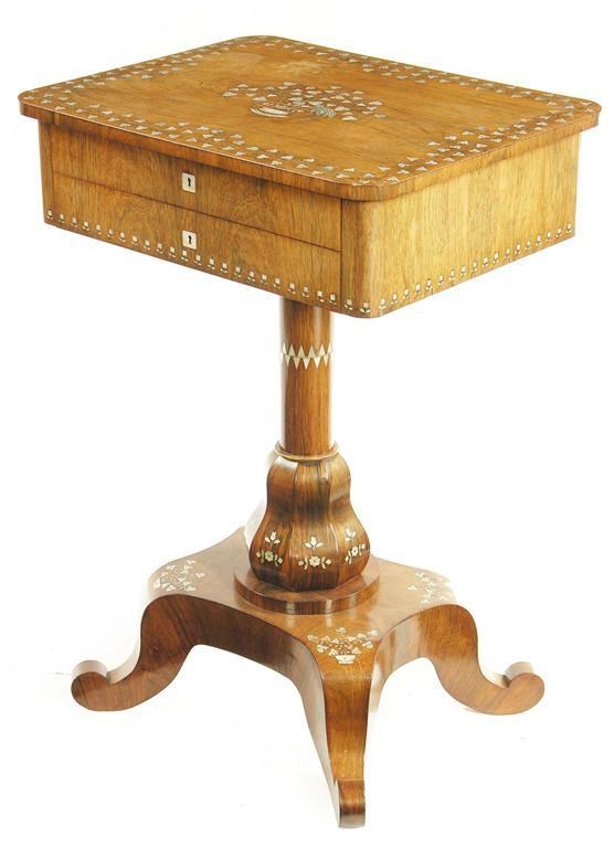 A 19th century continental rosewood and mother of pearl sewing table, inlaid allover with various designs of flowers and foliage with two frieze drawers, one fitted with lidded compartments and a folding mirror (broken), the turned stem above a faceted baluster, the platform base on scroll legs, 31.5in (80cm) h, 21.75in (55.5cm) w, 17.25in (43.8cm) d.