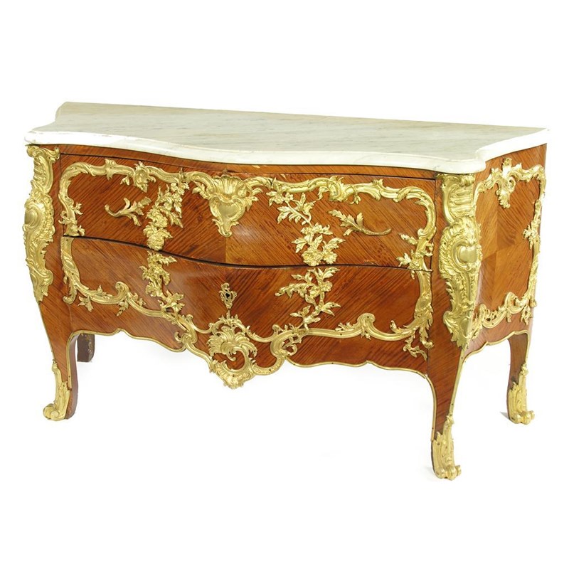A 19th century French kingwood and ormolu mounted serpentine commode, the Carrara marble moulded edge top above two long drawers, the mounts in rococo style with flowers and foliage, the conforming sides to scroll feet, 35.75in (90.6cm) h, 62in (157.5cm) w, 23.5in (59.6cm) d. One mount off but present.