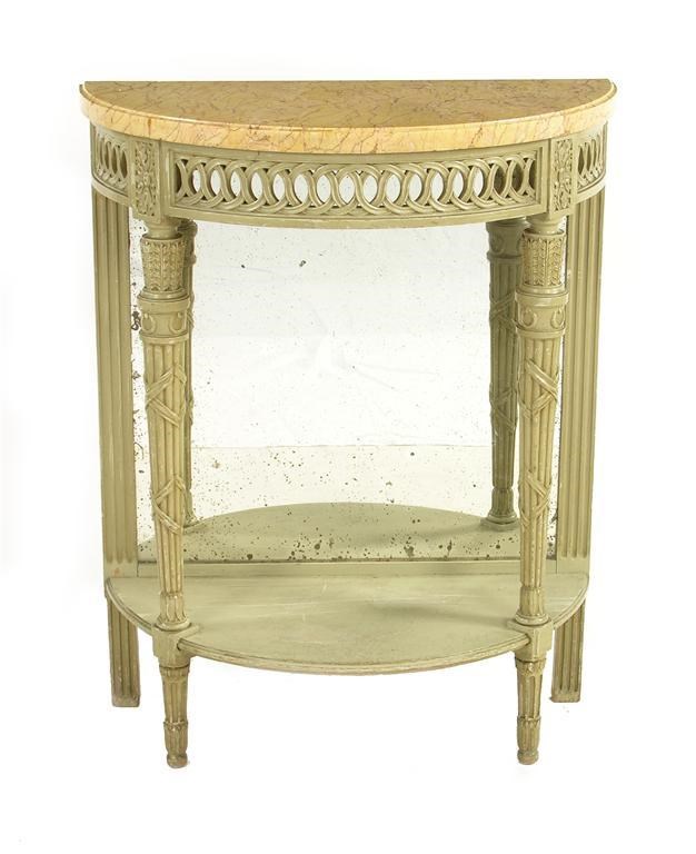 A late 19th century continental painted carved wood demi-lune console table, the Siena marble moulded edge top above a pierced frieze and carved tapering front legs, the mirrored back to an undertier, 35.75in (90.8cm) h, 28.75in (73cm) w, 14.5in (36.8cm) d.