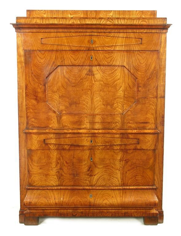 A 19th century continental 'Biedermeier' ash secretaire a abattant, the stepped cornice above a recessed panel front, the top drawer above a fall front enclosing an architectural interior of drawers, pigeon holes and secret compartments, above three further drawers, on block feet, 62.25in (157.7cm) h, 43in (109.4cm) w, 22in (56cm) d.