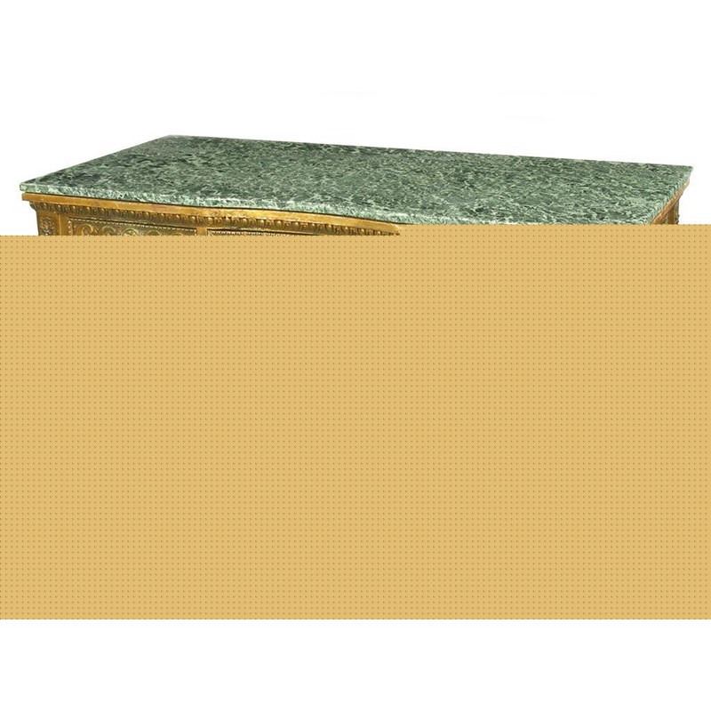A continental marble and gilt side table, the verde antico marble top with a concave front above an egg and dart moulding and three frieze drawers carved a Vitruvian scroll, on fluted tapering legs with carved ankles, 30.5in (77.4cm) h, 53.5in (136cm) w, 25.5in (64.7cm) d.