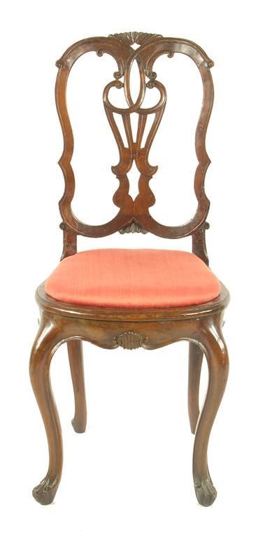 A continental walnut side chair, the carved, moulded and pierced back with a bell shaped drop-in seat, and a shell carved frieze on moulded cabriole legs. Possibly Italian, late 18th century.