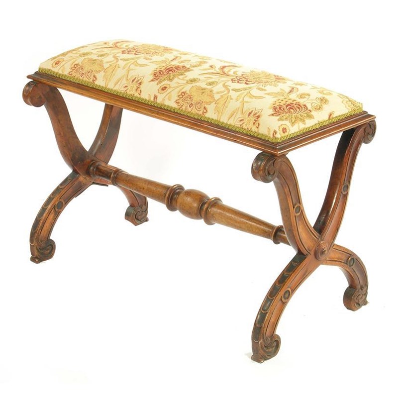 A Victorian walnut duet stool, the rectangular upholstered top on leafage carved 'X' shape supports, united by a turned stretcher, 21in (53.5cm) h, 33.5in (85cm) w, 16.25in (41.3cm) d. One leg with old break and repair.