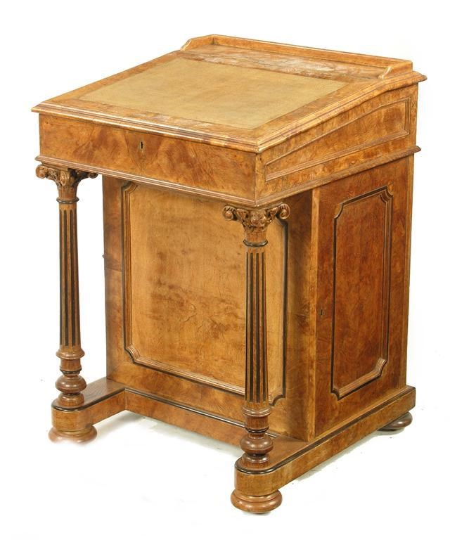 A Victorian pollarded oak and ebony Davenport, the top with a 3/4 gallery and an inset leatherette fall opening to reveal four drawers and two pigeon holes, the right hand side with a panelled cupboard door enclosing four drawers with sunken brass handles, the left side false, on carved Corinthian capital supports, disc feet and ceramic castors.