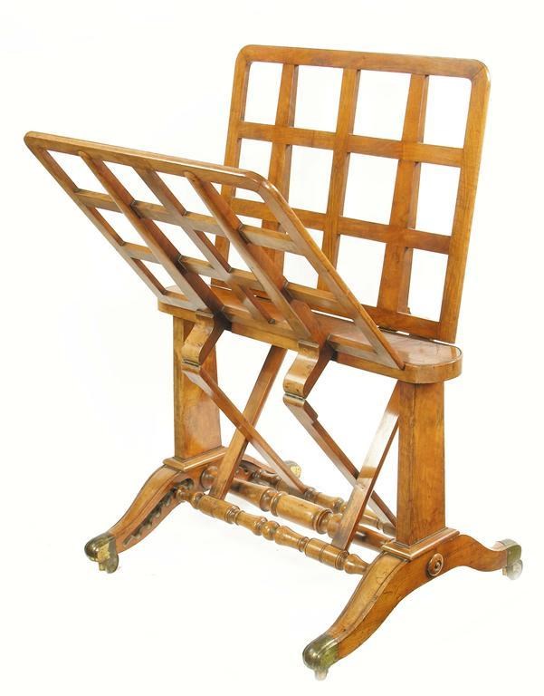 A Victorian walnut folio stand, by Holland & Sons, the hinged slatted sides, on turned stretchered ratchets, on solid trestle ends to scroll legs and brass sabots and castors, the hinges stamped 'HUXLEY & CHING', the base stamped 'HOLLAND & SONS', 46.5in (118cm) h, 33in (84cm) w, 27in (68.6cm) d.