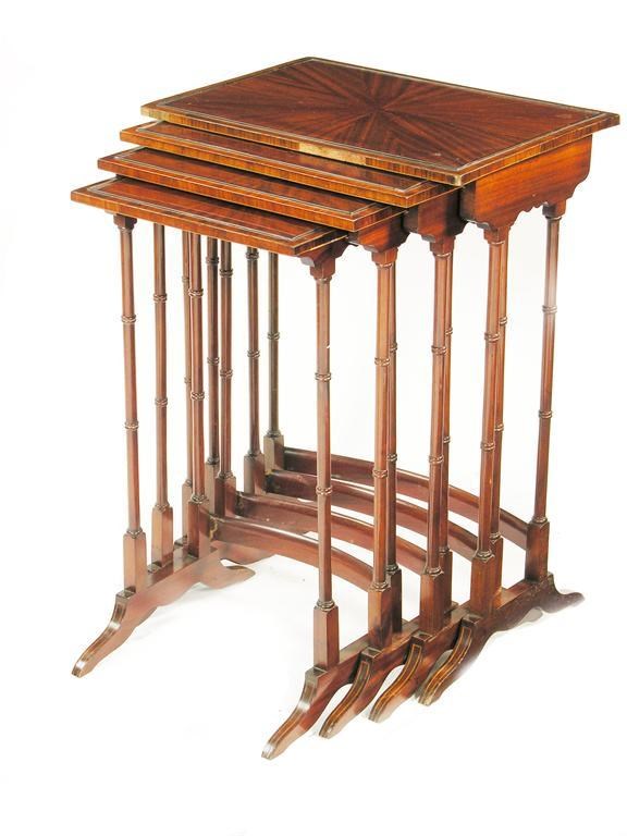 A set of mahogany quartetto tables, the rectangular beaded tops with kingwood banding on ring turned supports united by a curved stretcher, on line inlaid scroll feet, with ivorene label 'S&H JEWELL, 131-2, HIGH HOLBURN, LONDON W.C.1.', 25.25-27.25in (64.2-69.2cm) h, 13.25-19.5in (33.8-49.5cm), 11-13.75in (27.7-35cm) d. (4) Old damages and losses to veneer.