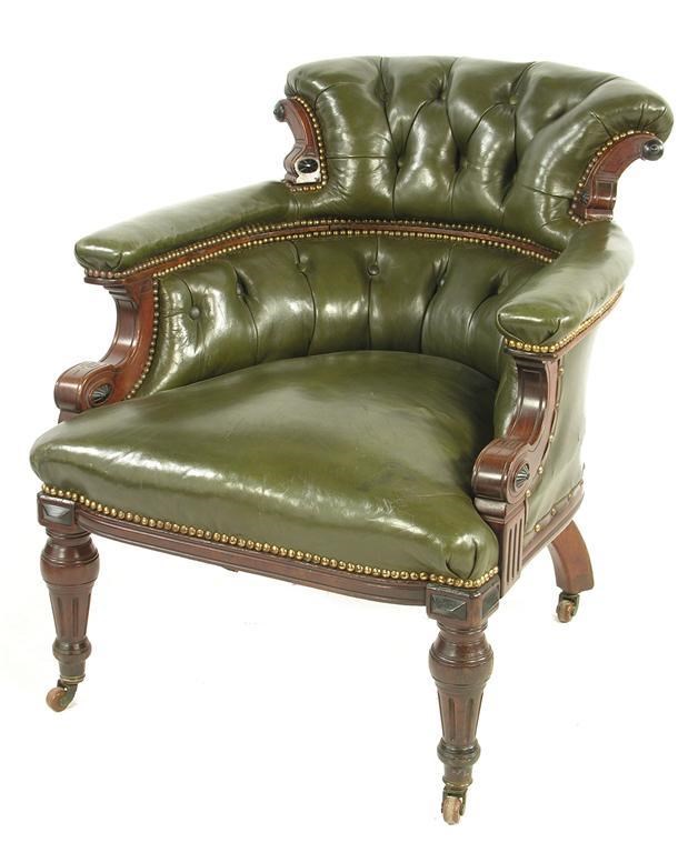 A late Victorian mahogany and ebony tub armchair, the later green leather upholstery to an incised decorated frame, on front fluted tapering legs to ceramic castors.